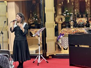 お勤めの後はもちろんご法話です。ご講師は谷川 弘顕先生のお話しをお聴聞し仏法に浸るひとときを楽しませてもらいました。その後コンサートがあり、ふくい舞さんの素敵な歌を堪能しました。ふくい舞さんはTVドラマ『恋空』の主題歌「アイのうた」を歌われ同年、日本レコード大賞新人賞を受賞された方です。