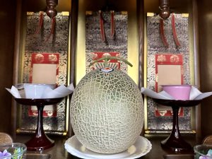 今日でお盆参りを終えました。滞りなく終え少しホッとしています。この時期のお供でよくお見かけするのがスイカにメロン。素麵に水ようかんなど夏の季節にふさわしいお飾りです。今回は豪快なメロンのお供えと左右に水ようかんをお飾りされているご門徒さんです。阿弥陀さまも親鸞さまも蓮如さまも姿は見えません。が有り難いお供えです。