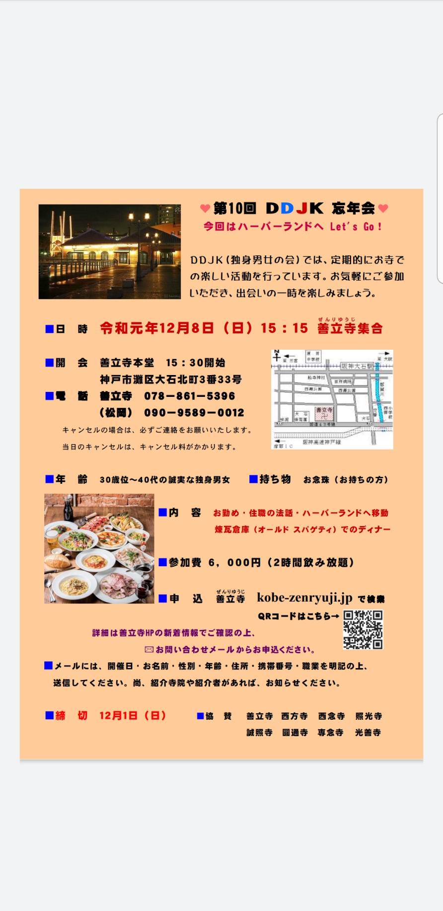 今年最後の独身男女の会(DDJK)のご案内です。定期的にお寺で楽しい活動を行っております。お気軽にご参加いただき、ご縁という大切なひとときを楽しみましょう。詳細は以下の通りです。・日時:令和元年12月8日(日)15時15分 善立寺集合。・場所:善立寺本堂(神戸市灘区大石北町3番33号)・電話:078-861-5396 ・年齢:30歳位~40代の誠実な独身男女。 ・内容:お勤め、法話、ハーバーランドへ移動して煉瓦倉庫にてディナー ・参加費:6000円。お気軽にお申込みください。