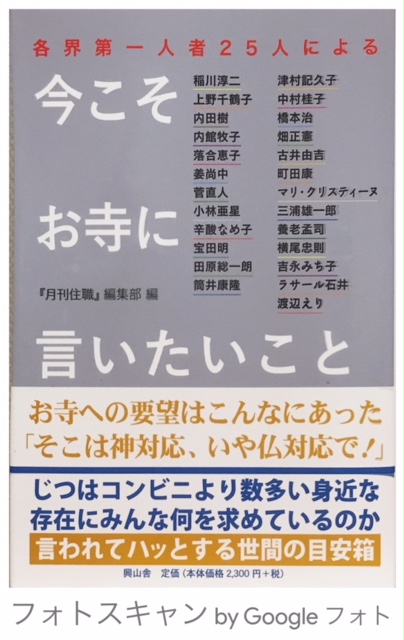 昨日木曜日に記し予約投稿したんですが不具合でブログの更新ができていませんでした。そのため本日、金曜日ですが副住の無稽独語を記します。副住職が気ままにでたらめに記すことです。最近読んだ本。その名も「今こそ お寺に 言いたいこと」。各界の25人、それぞれに様々なとらえ方があっておもしろい。その反面、なんじゃこりゃと思えるところも。バカの壁の著者、養老孟司先生の題名は「お坊さんという壁」。華厳経研究会に参加したとき河合隼雄さん、中沢新一さん2人が集まると同じことを言っておられたと。「仏教は好きだが坊さんは嫌いだ」と。仏教には魅かれるが、お坊さんという壁がある。しかしそれはそれでいいじゃないかと養老先生は記されている。坊さんは嫌いってはっきり言われる方が清々しいような気も。 流行語の神対応ではなく、仏対応でいきましょう。