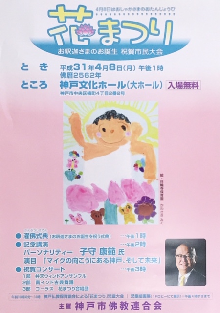 明日4月8日はお釈迦さまがご誕生なさった行事、花まつりです。神戸文化ホール(大ホール)で13時より式典、記念講演があります。記念講演はパーソナリティーの子守 康範氏です。演目は「マイクの向こうにある神戸、そして未来」です。他にも祝賀コンサートもあります。入場無料ですのでぜひご来場くだされば嬉しいです。