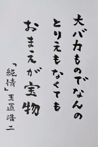「大バカものでなんのとりえもなくてもおまえが宝物」という歌詞です。純情というこの歌は最初の入りが「いつだって会いたいよ かあちゃんに会いたい」です。玉置さんのお母さんが息子の浩二さんに言われた言葉であります。