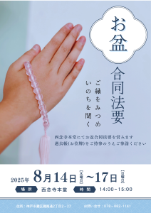西念寺ではお盆合同法要を執り行っております。期間は8月14日(木)~17日(日)まで。お時間は14時から西念寺本堂にてお勤めします。どなたさまもお参りできますので過去帳(位牌)をご持参ください。14時という暑い最中の時間帯ですので熱中症などには充分にご注意しご参拝ください。本堂をキンキンに冷やしてお待ちしております。