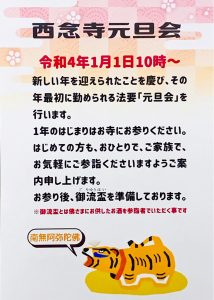 今年も残すとこわずかとなりました。年の瀬でなにかとせわしないことと存じます。コロナ禍第6波も迫っております。改めて気を引き締め年末年始を大切にお過ごしください。さて西念寺元旦会のご案内です。令和4年(2022年)1月1日 10時より西念寺本堂におきまして元旦会を執り行います。年のはじまりもお寺にお参りください。年初めのお参りは一緒に阿弥陀さまの前でお念仏申させてもらいましょう。はじめての方も、よくお参りなさる方も、ご家族で、おひとりで、気軽にお越しくだされば幸いに存じます。お参り後、ちょびっとだけ御流杯(阿弥陀さまにお供したお酒)とお茶やコーヒーなどを準備しております。どなた様も万象お繰り合わせの上ご参詣くださいますようご案内申し上げます。